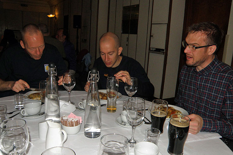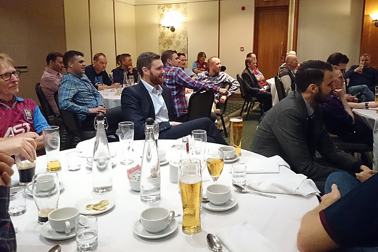 Fredag aften var vi af den norske fanklub inviteret til 3-retters middag på Copthorne Hotel, hvor ca. 50 norske Aston Villa-fans boede. Med til aftenen var også fem medlemmer fra den svenske fanklub, der også var godt repræsenteret i Birmingham denne weekend, og så var de tidligere spillere Andy Blair, Gary Shaw og Garry Thompson også inviteret med, så efter en lækker middag fortalte de lidt anekdoter fra deres karrierer. Det var virkelig en god og hyggelig aften, hvor der også var god snak ved bordet med folk fra Norge, og hvor der var en fin stemning bl.a. med smuk sang og underholdning fra Andy Blair.